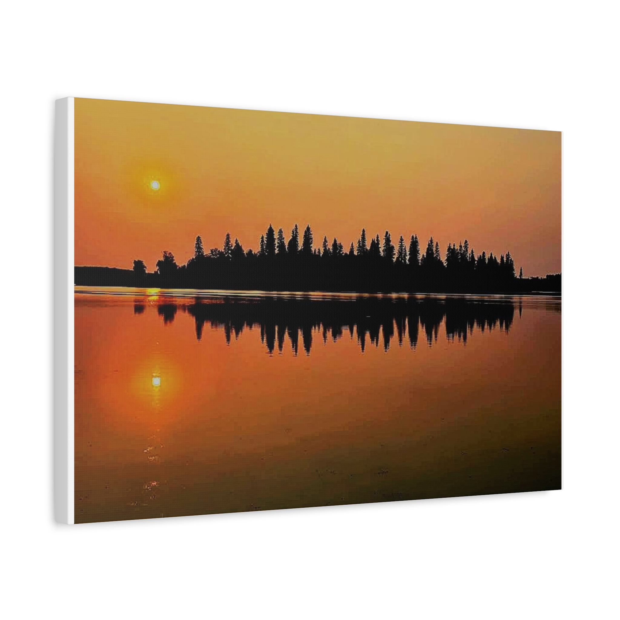 A matte stretched canvas that brings quiet sunsets indoors. The photo captures a low orange sun and the mirrored silhouette of treetops across still water — warm, minimal, and meditative. Hung above a sofa or in a reading nook, the print settles a room with amber light and reflective calm. The thin 1.25″ profile keeps the image front-and-center while the soft rubber dots and included back-hanging hardware make installation steady and simple. Sustainably framed in FSC-sourced radiata pine and printed with non-toxic latex inks, this canvas blends mindful materials with a tranquil scene you’ll return to day after day.