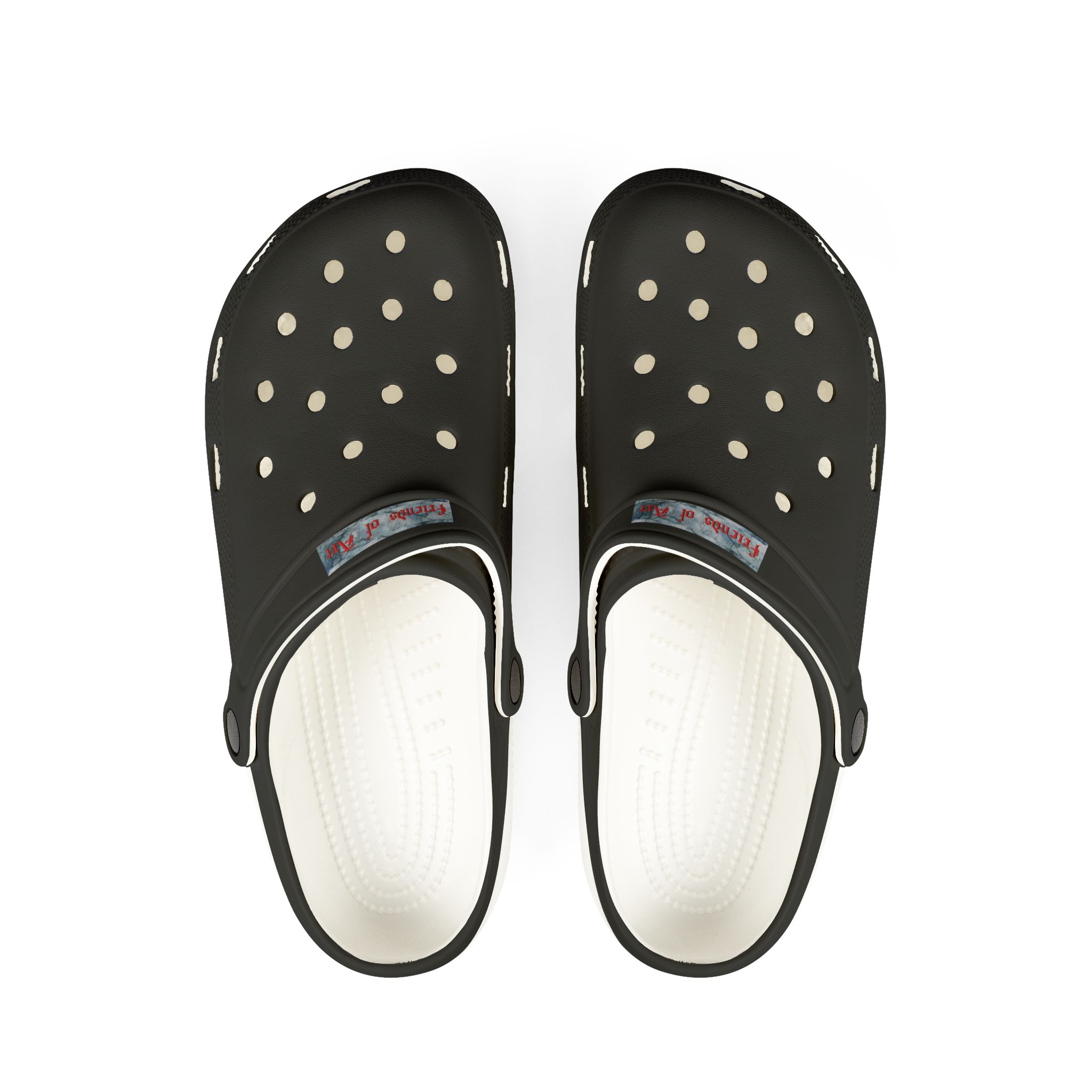 Support the Realm of Art and be a Friend of Art by sliding into lightweight comfort with these EVA foam crocks — breathable, cushioned, and made for days when practicality meets playful style, while the soft, flexible EVA sole absorbs steps and keeps you moving without fatigue. Perforations across the toe box let air circulate, and the back strap secures the fit for quick errands, garden breaks, or lounging at home. Each pair arrives with a small set of decorative clog charms to personalize your look. Black-and-white insole/outsole options keep the silhouette clean and versatile. These clogs feel like the kind of easy, reliable footwear you reach for again and again.