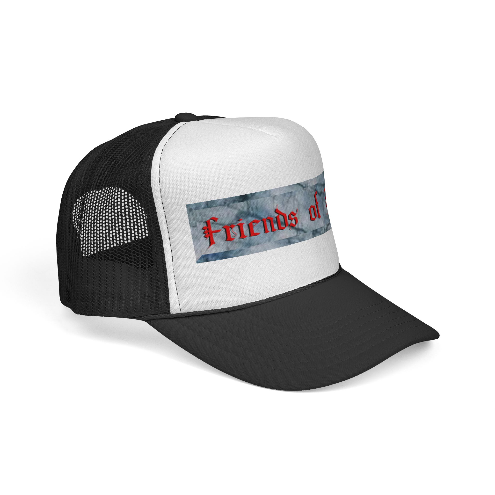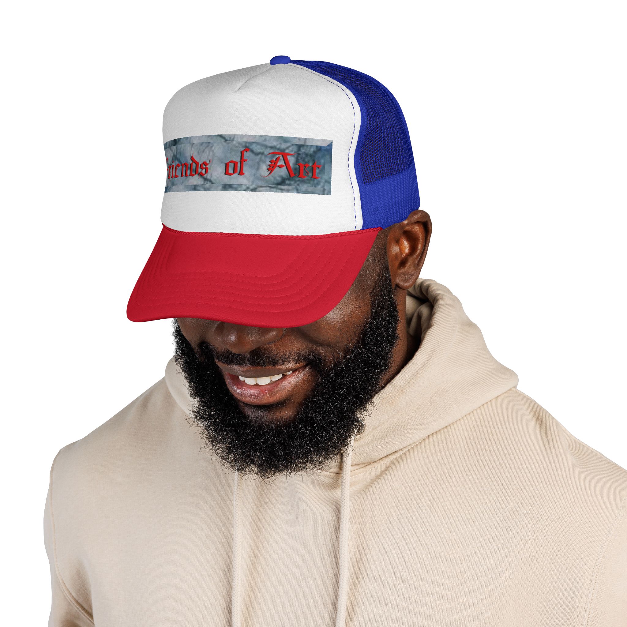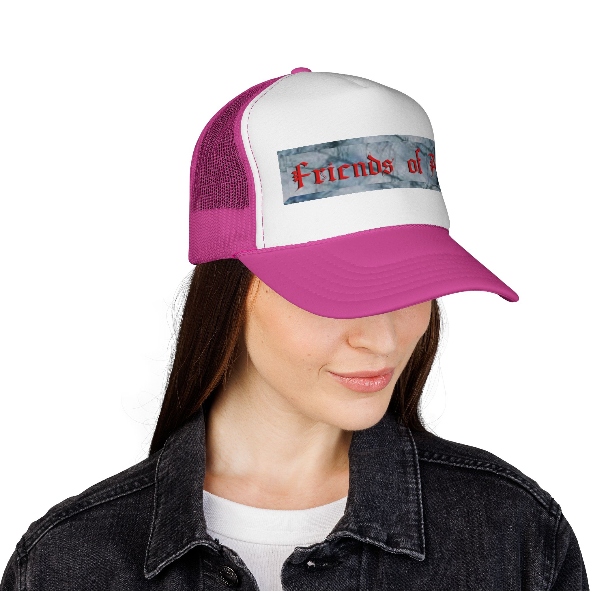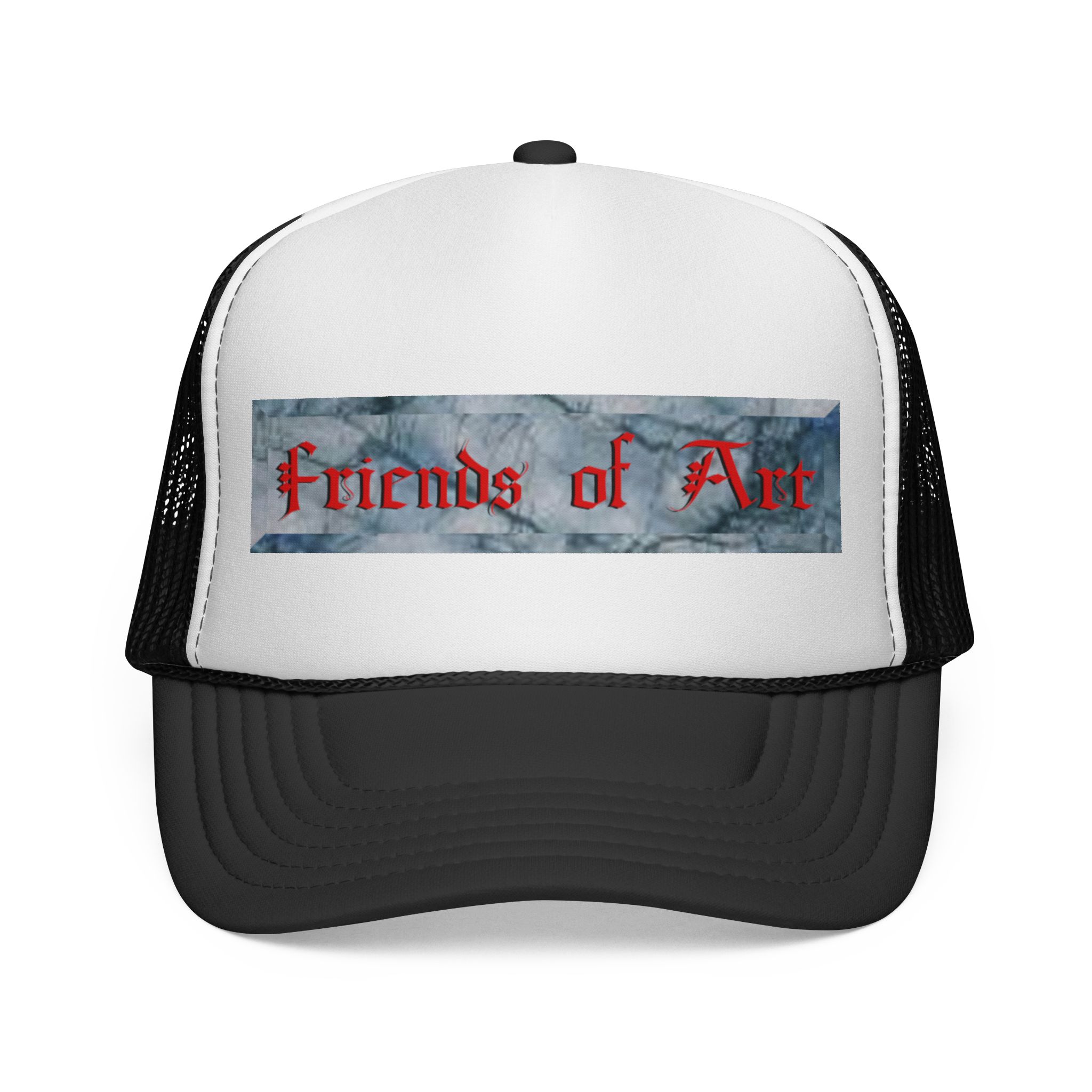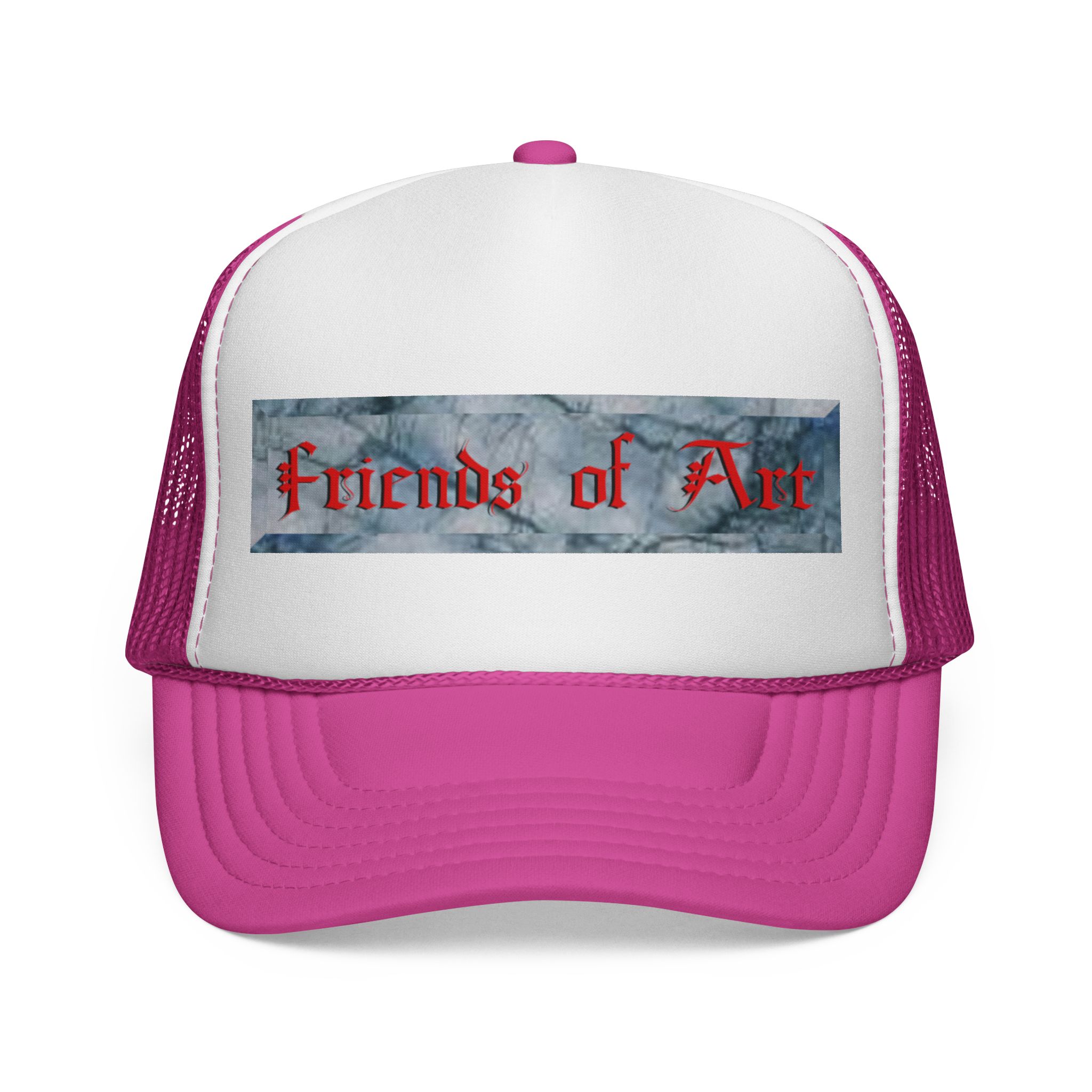 Support The Realm of Art and be a Friend of Art. This trucker cap brings a casual, creative edge to everyday wear. The structured foam front showcases a distressed, painterly stripe with bold, gothic-style lettering that reads “Friends of Art,” while the ventilated nylon mesh back keeps you cool on warm days. Bright, color-matched details — from the undervisor and sweatband to the braid and snap closure — give the cap a cohesive, made-to-order look. It adjusts easily with a plastic snap to sit comfortably on most adult heads. Wear it to studio openings, outdoor art markets, or whenever you want to signal that you live for creativity and community.