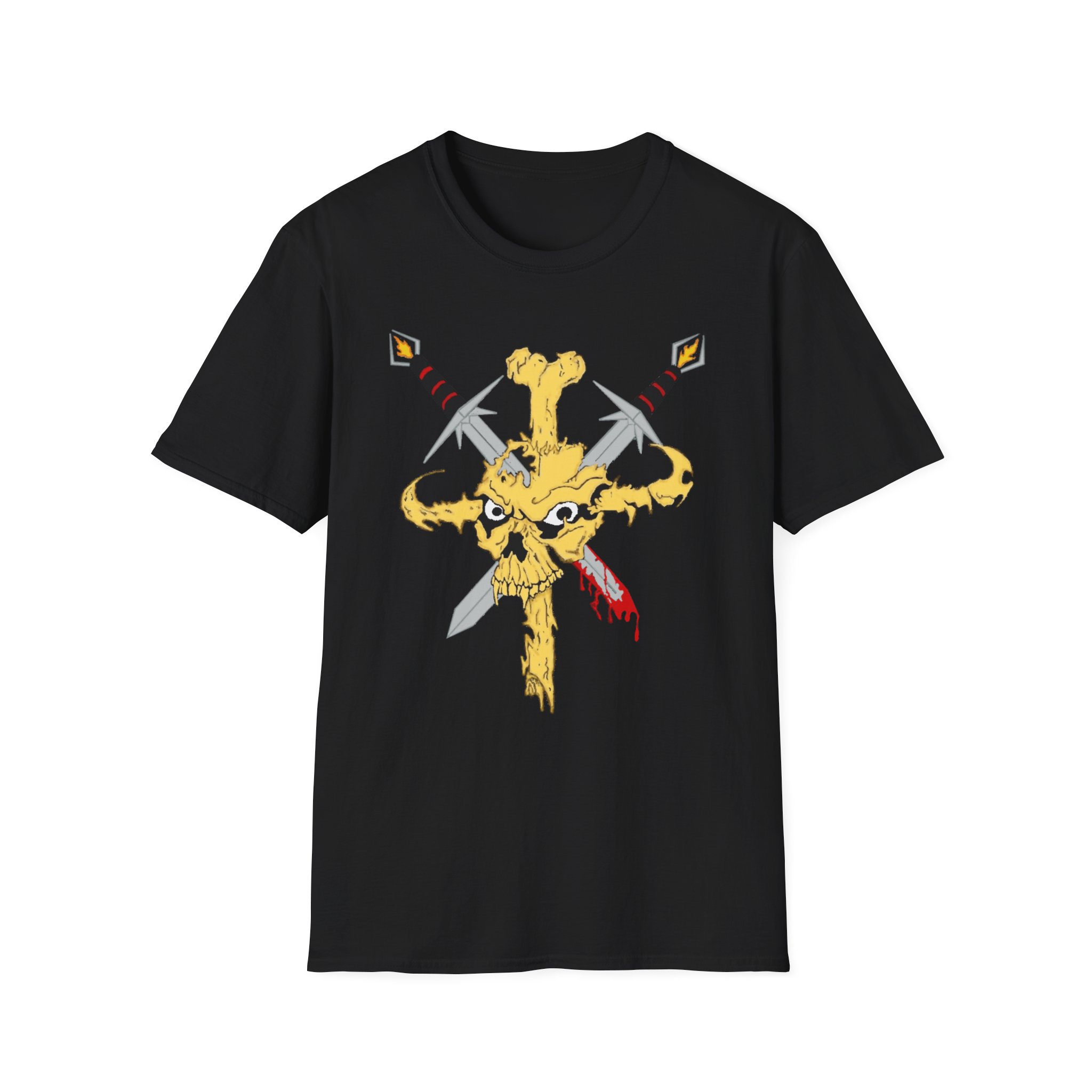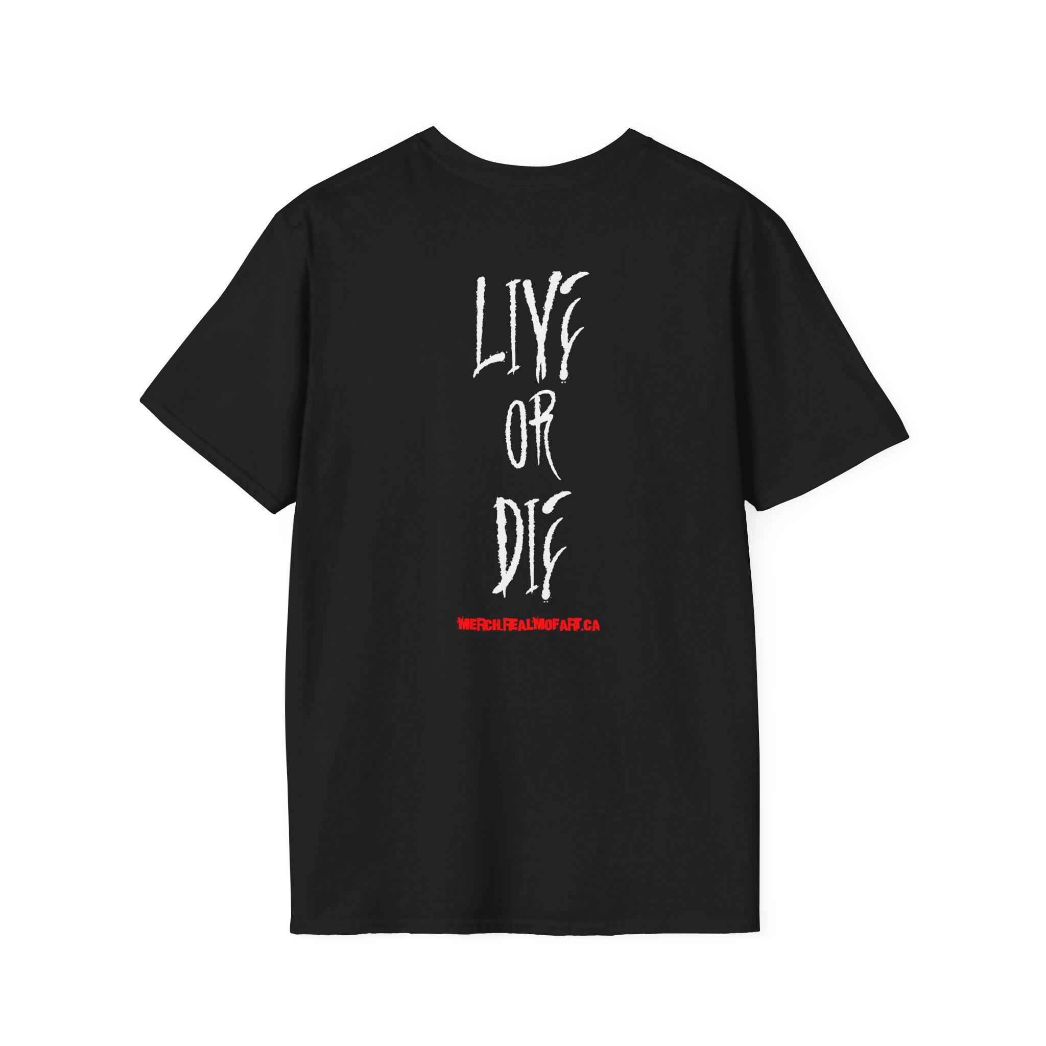 A bold, wearable statement for those who like extreme sports or live and fight for what matters. This lightweight crew tee carries a raw, hand-drawn emblem on the front — a weathered golden cross knot with fierce eyes and crossed blades — and a tall, distressed 'LIVE OR DIE' script down the back with a small strike of red beneath. It feels like a road-worn banner you can pull on before a show, a ride, or a late-night city wander. The fabric is soft against the skin, drapes cleanly, and keeps its shape so the graphic stays front-and-center. Wear it layered under a leather jacket or alone with ripped denim; it holds up to frequent wear and keeps its edge.