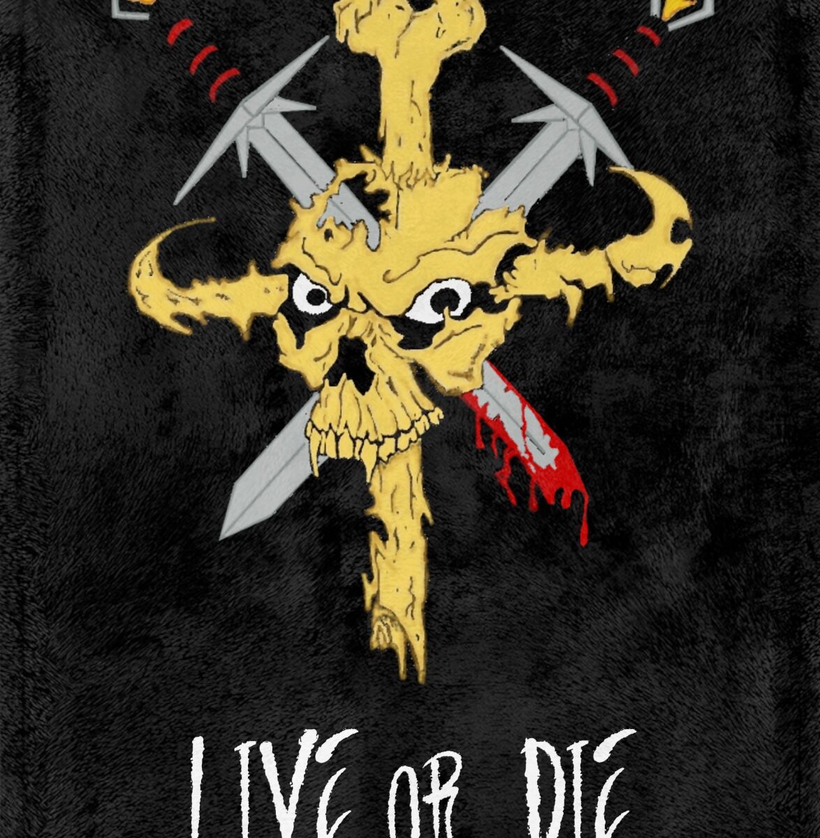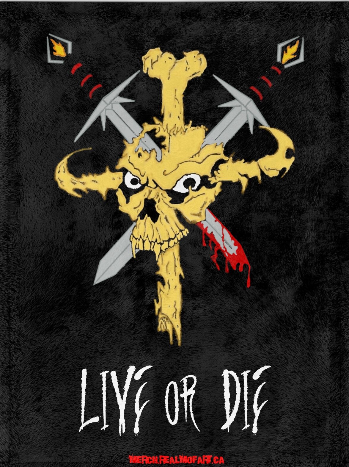 A velveteen microfiber blanket that brings bold attitude and cozy warmth into late-night skate sessions, basement hangouts, or layered on a dorm bed. The one-sided print features a gritty skull-and-swords motif with splashes of blood-red and distressed lettering that reads “Live or Die,” set against a deep black field. It feels velvety to the touch and plush enough to curl up in while watching cult horror movies, raving at a backyard bonfire, or pacing through creative late-night work. Durable hemmed edges and a 2″ stitched border keep the design sharp wash after wash, while vibrant printing holds the colors true to the original artwork. Available in three sizes, this blanket blends hardcore style with everyday comfort for anyone who prefers bold, unapologetic decor.