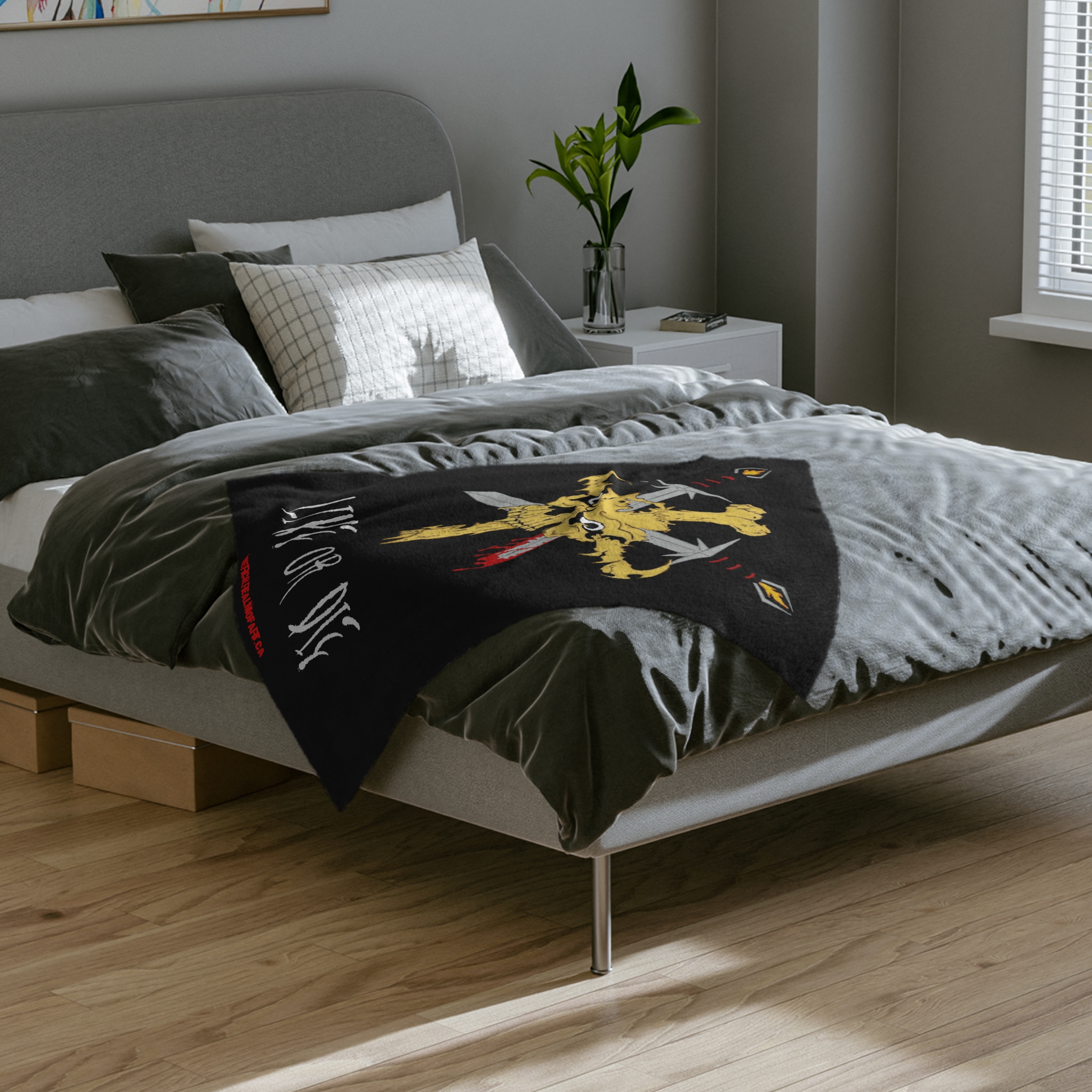A velveteen microfiber blanket that brings bold attitude and cozy warmth into late-night skate sessions, basement hangouts, or layered on a dorm bed. The one-sided print features a gritty skull-and-swords motif with splashes of blood-red and distressed lettering that reads “Live or Die,” set against a deep black field. It feels velvety to the touch…