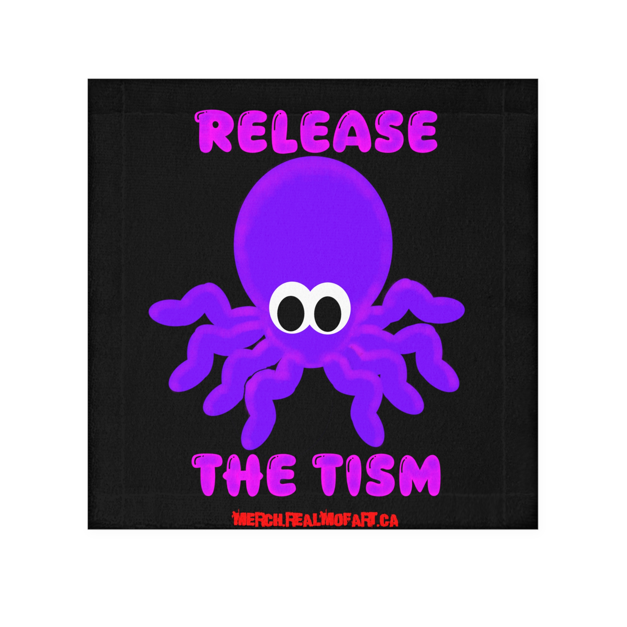 Bright, playful face towel made for quick cleanups and cheerful moments. One side shows a bold, purple cartoon octopus on a contrasting background with the phrase “RELEASE THE TISM,” while the reverse is soft, absorbent white cotton. Lightweight and gentle to the touch, it dries fast and keeps its shape wash after wash. Bring it to your bathroom, studio, or on-the-go kit to add a pop of color and a wink of humor to everyday routines.