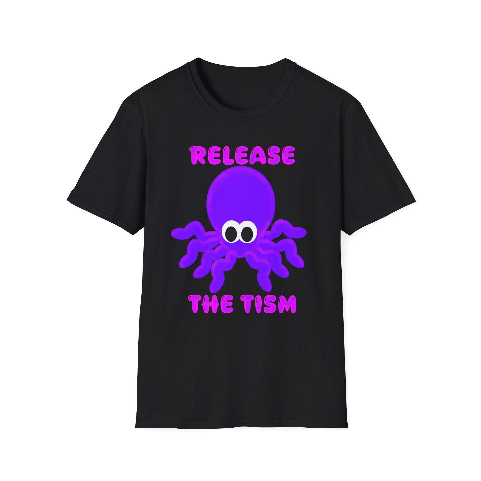 This lightweight cotton tee brings a playful, slightly strange energy to everyday wear. A bold purple octopus with wide, curious eyes sits center chest above the cheeky phrase “RELEASE THE TISM” in matching neon lettering — equal parts goofy and defiant. The shirt’s soft, ring-spun cotton feels smooth against skin and drapes cleanly with a classic crew neckline. It’s the kind of top you reach for when you want to spark a laugh, make a subtle statement, or lean into alternative, internet-ready humor while staying comfortable all day.