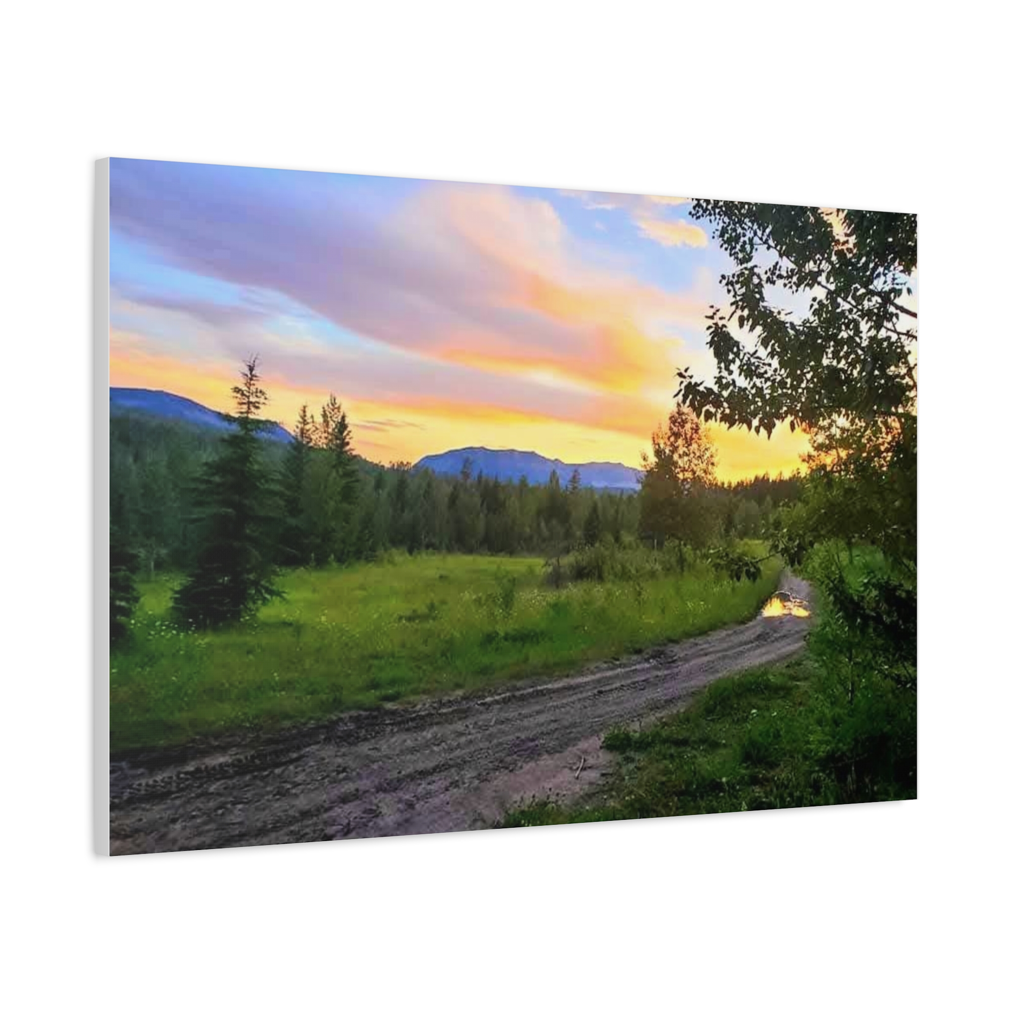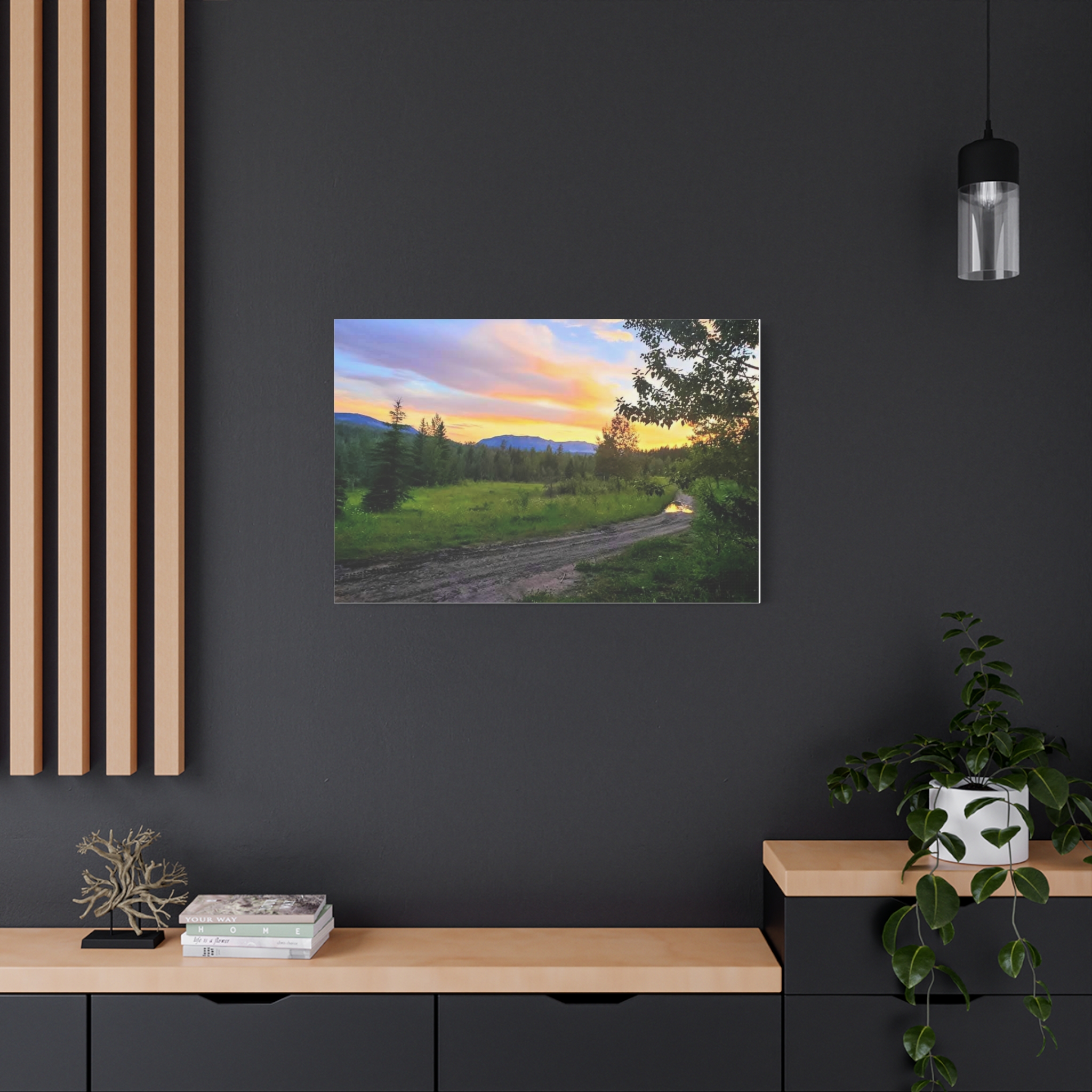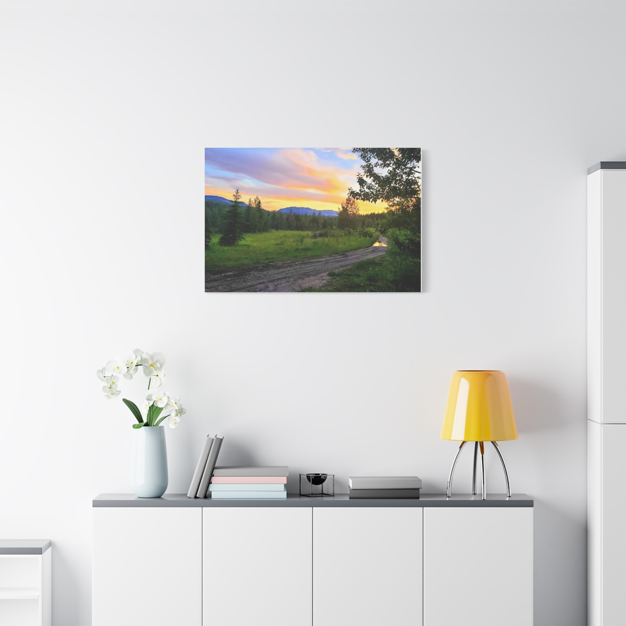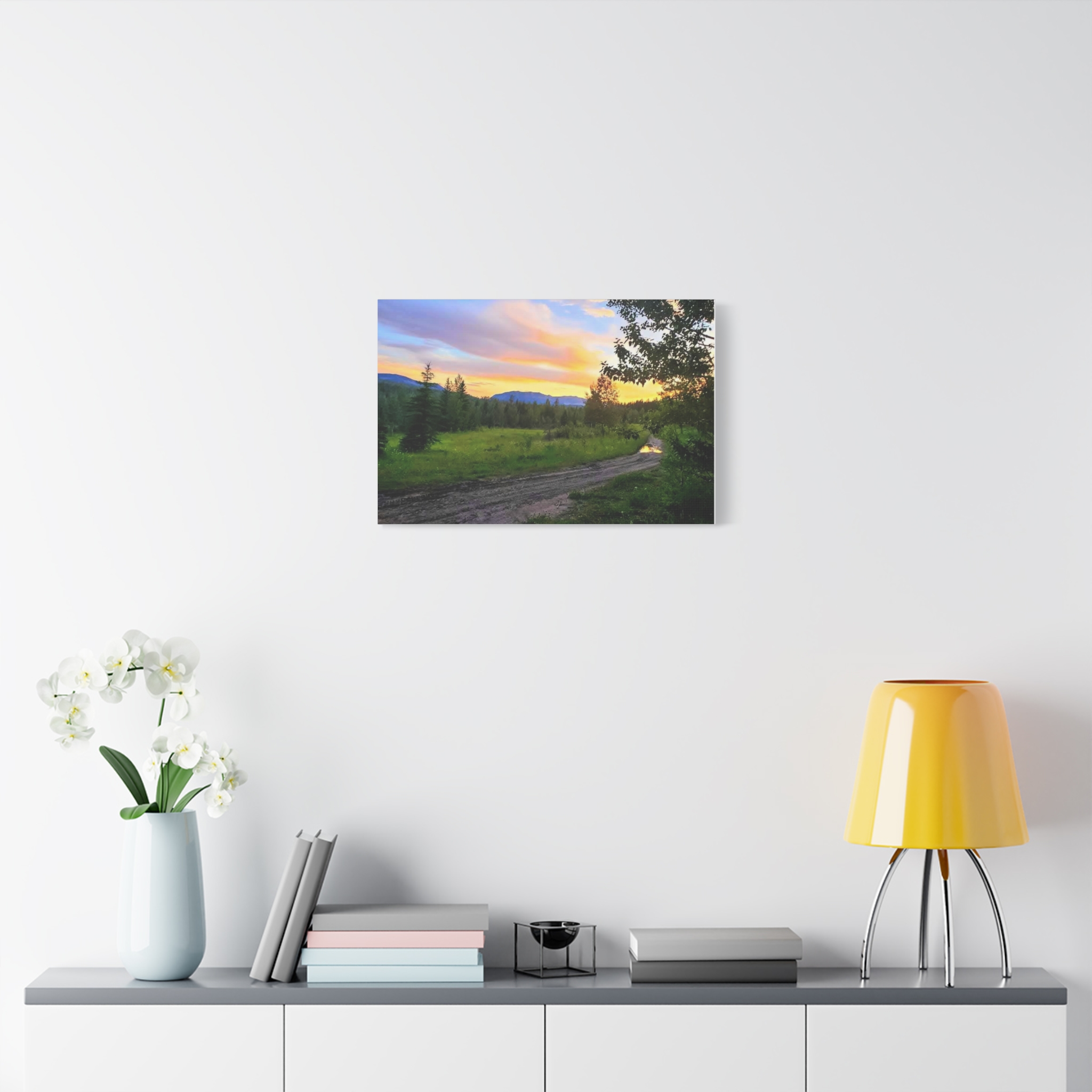 A matte stretched canvas that brings a quiet summer evening into your home. The soft, textured cotton-poly surface holds rich, Greenguard Gold certified colors printed with non-toxic latex inks, creating a dulled, natural finish that complements rustic and modern interiors alike. Stretched over a 1.25″ radiata pine frame from responsibly managed forests, the print arrives ready to hang with back hanging hardware and soft rubber dots on the lower back to keep it sitting flush. Available in multiple orientations and sizes, this canvas works as a serene focal point above a mantel, in a hallway, or layered with other wall art in a cabin, cottage, or city apartment that craves a slice of open landscape.