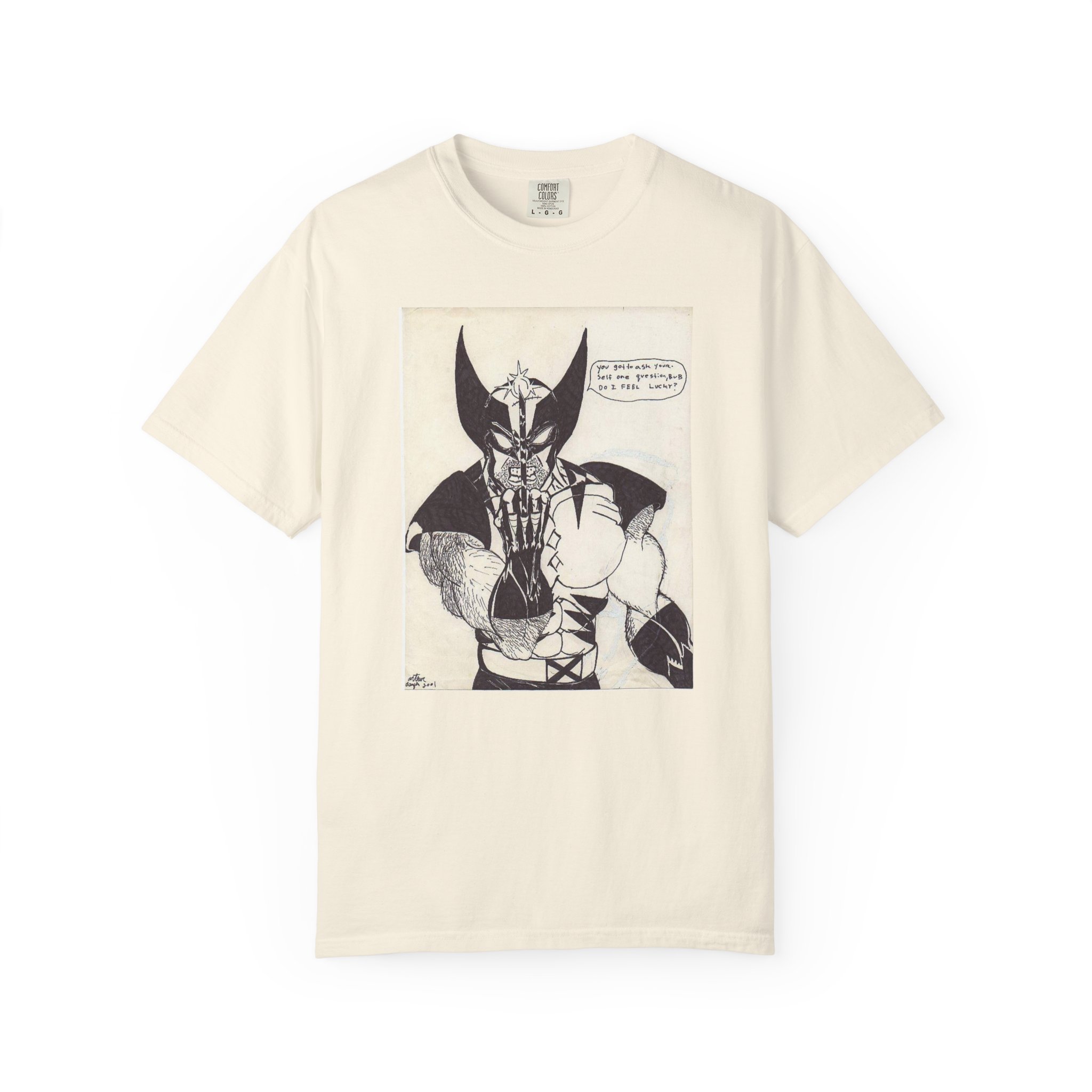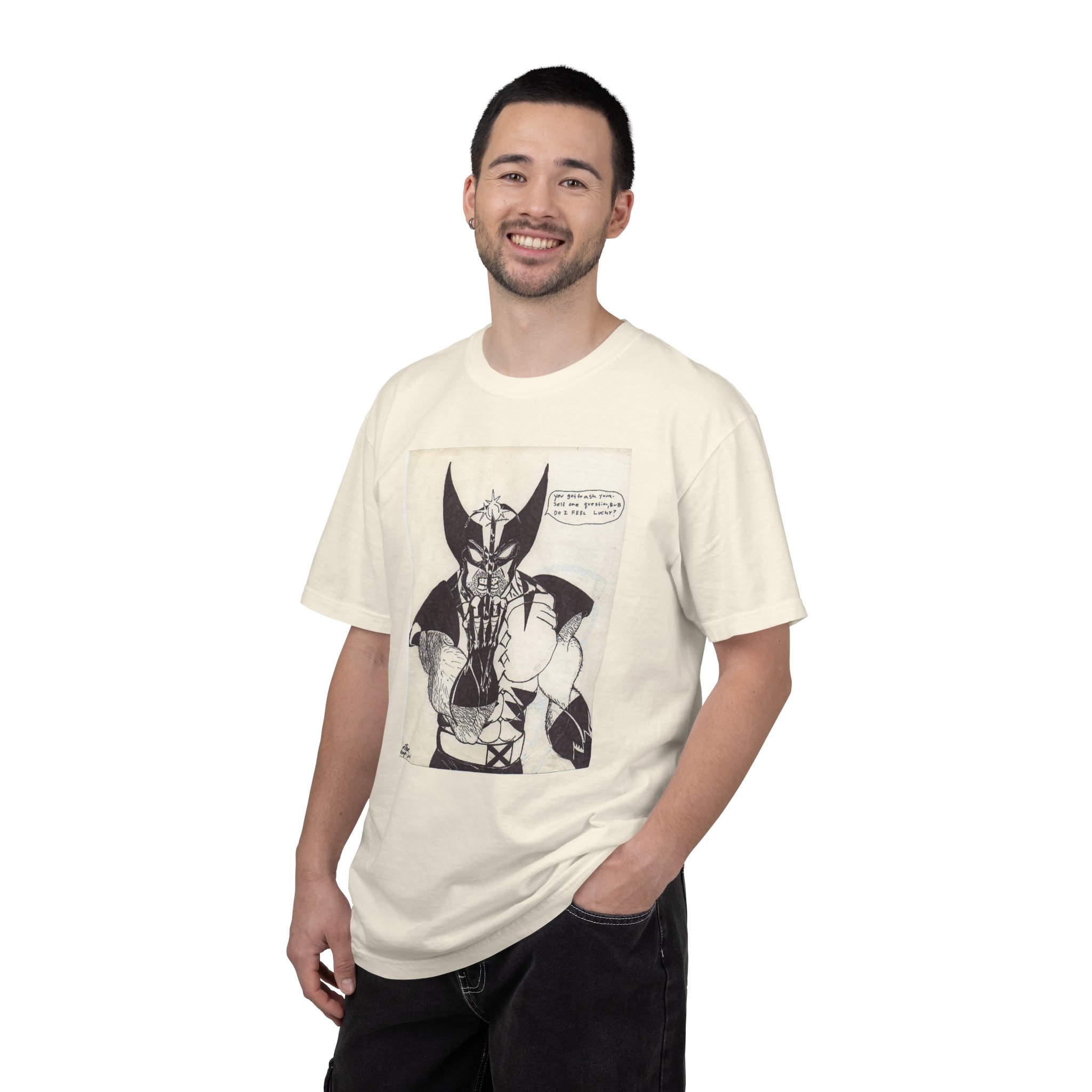 This heavyweight garment-dyed tee wears like a lived-in favorite from day one. The soft, textured cotton drape carries a bold, hand-drawn comic panel on the chest — an inked, slightly gritty illustration that reads like a snapshot from a late-night sketchbook. It sits relaxed on the body, shoulders dropping into roomy sleeves and a comfortable torso that moves with you. Wear it to a gallery crawl, a low-key show, or when you just want a statement piece that still feels like your oldest shirt. The print’s offbeat, introspective vibe pairs with faded colors and a lived-in feel to create a tee that’s quietly expressive and ready for everyday life.
